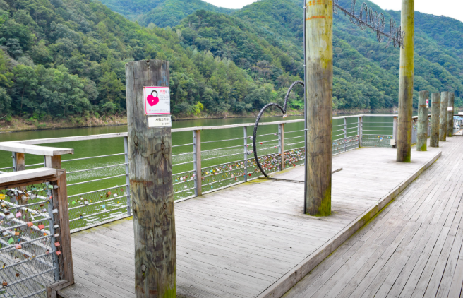 향수호수길이라는 독특한 이름은 옥천이 고향인 정지용의 시 ‘향수’와 ‘호수’의 제목에서 따왔다. 정지용의 시처럼 아름답고 향토적인 이름이다. 향수호수길은 주차장이 따로 없기 때문에 선사공원 주차장을 이용해야 한다. 선사공원 주차장에 주차를 하고 건너편으로 건너가면 붉은색 아스팔트 바닥에 향수호수길이라고 크게 적힌 글자가 보인다.